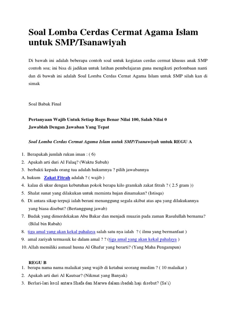 Jawaban soal cerdas cermat agama islam injil malaikat izrail 10 mukmin kabah takbir atau allohu akbar iftirasy. Soal cerdas cermat agama islam 2019 ini adalah salah satu hal yang wajib kamu tahu dimana admin blog soal kunci jawaban menyampaikan soal cerdas cermat agama islam 2019 kepada teman teman semua yang saat ini mencari soal cerdas cermat agama islam 2019 dengan ini maka kamu akan tahu selengkapnya pembahasan soal cerdas cermat agama islam 2019.